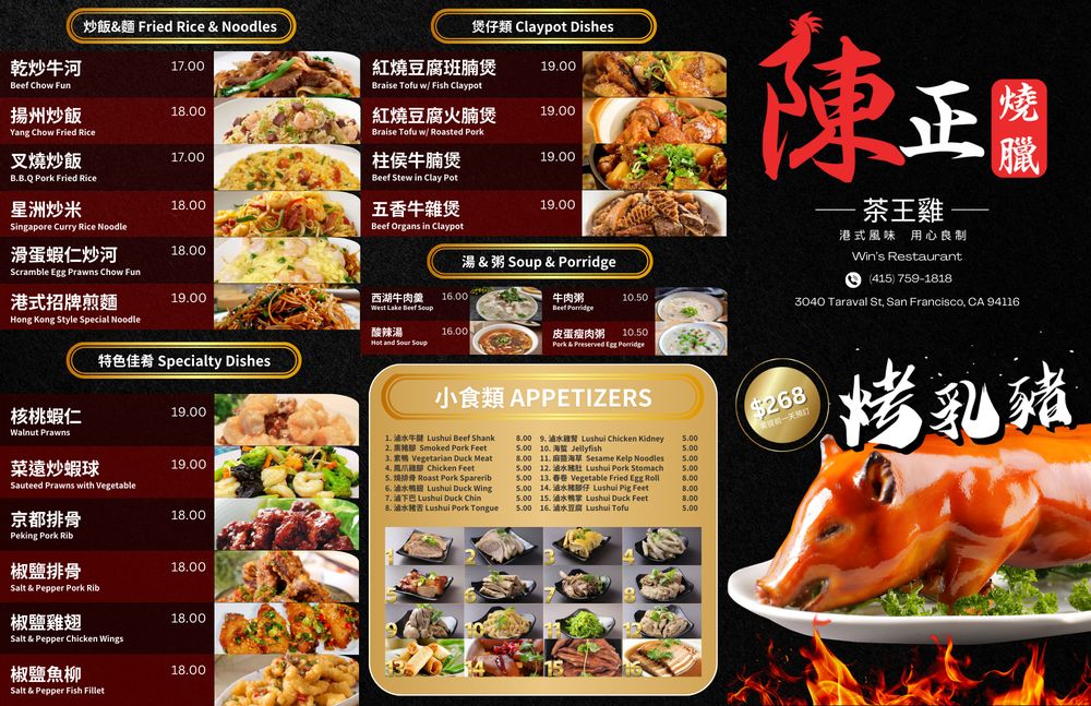 Welcome to Win’s Restaurant, a delightful haven for Chinese cuisine located in the heart of San Francisco at 3040 Taraval St. With a cozy and casual atmosphere, it's the perfect spot for families, groups, or individuals looking to enjoy authentic flavors. The menu boasts an extensive selection of vegetarian options alongside savory meat dishes, ensuring there's something for everyone.