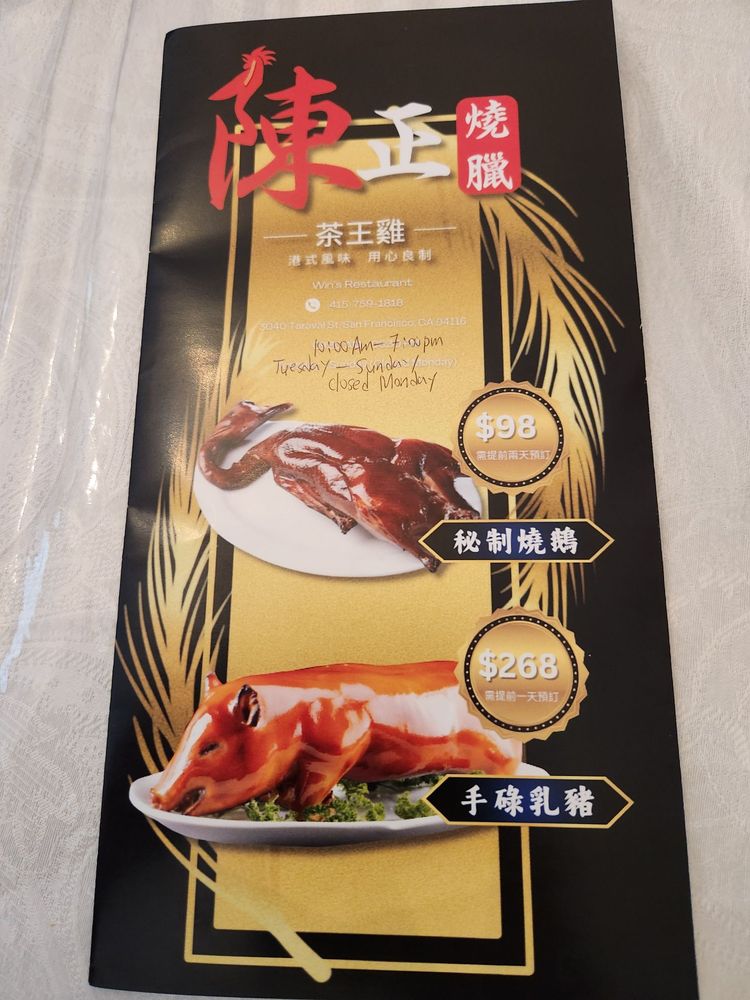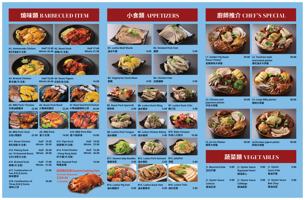 roasted duck, roasted pork, b.b.q. pork & soy chicken.